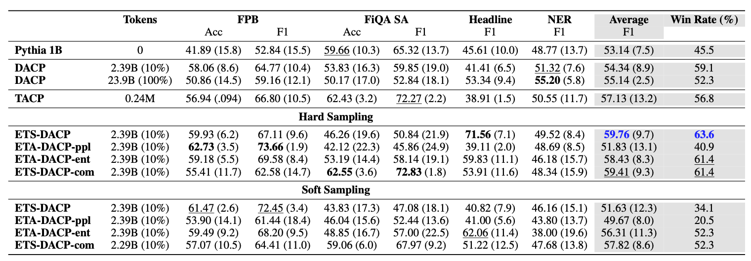 ETS-DACP)이 100%를 모두 학습한 모델(DACP)보다 금융 분야에서 훨씬 뛰어난 성능을 보였습니다. 비용은 10분의 1로 줄이고 성능은 오히려 높인 것입니다. -