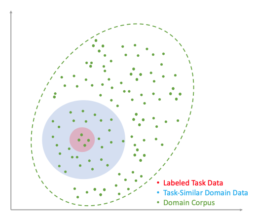 논문의 핵심 아이디어. 거대한 도메인 데이터(녹색) 중에서 목표 작업(적색)과 가장 관련성이 높은 '알짜배기' 데이터(청색)만 선별하여 학습 효율을 극대화합니다.
